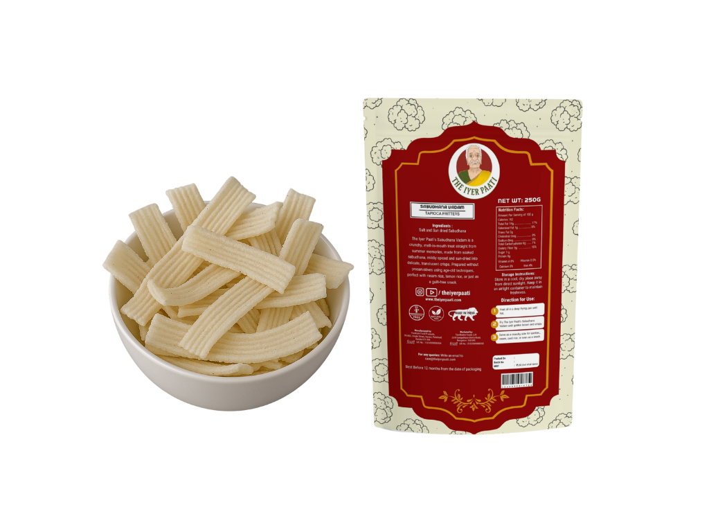 The lyer Paat’s Sabudhana Vadam is a crunchy, melt-in-mouth that straight from Summer memories, made from soaked sabudhana, mildy spiced and sun-dried into delicate, translucent crisps. Prepared without preservatives using age-old techniques, perfect with rasam rict, lemon ice, or just as a guilt-free snack